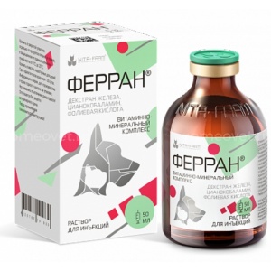 Ферран - железо-витаминный комплекс, активизирующий процессы кроветворения и окислительно-восстановительные реакции, способствующий повышению общей резистентности организма. При парентеральном введении восполняет в организме недостаток железа, фолиевой кислоты (витамина В9) и цианокобаламина (витамина В12), вызванный экологическими причинами, потерей крови, погрешностями в кормлении или заболеваниями животных.